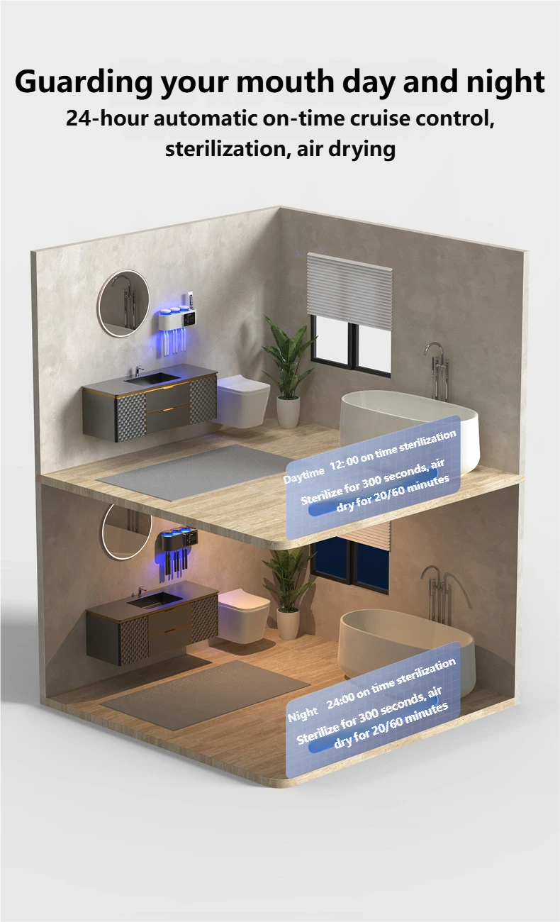 Deep UV Sterilization + Turbo Drying: Utilizes 270NM deep ultraviolet light combined with a turbo fan for dual antibacterial action. It sterilizes both toothbrushes and cups simultaneously, effectively destroying bacterial DNA. Two drying modes (20min/60min) adapt to various humidity levels.